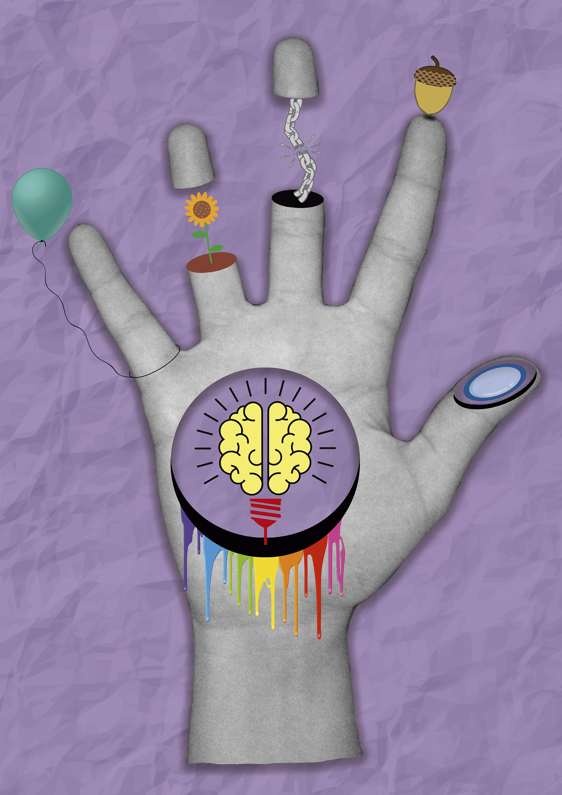 A imagem é composta por um backgroud de papel amassado para simbolizar todos os erros e tentativas. A mão representando a questão de personalidade/digital (foto da minha mão). Do mindinho ao dedão os elementos fazem alusão a: criatividade, sustentabilidade, liberdade de expressão, obstinação e observação, e na palma os princípios interligados trabalhando para gerar uma nova ideia.